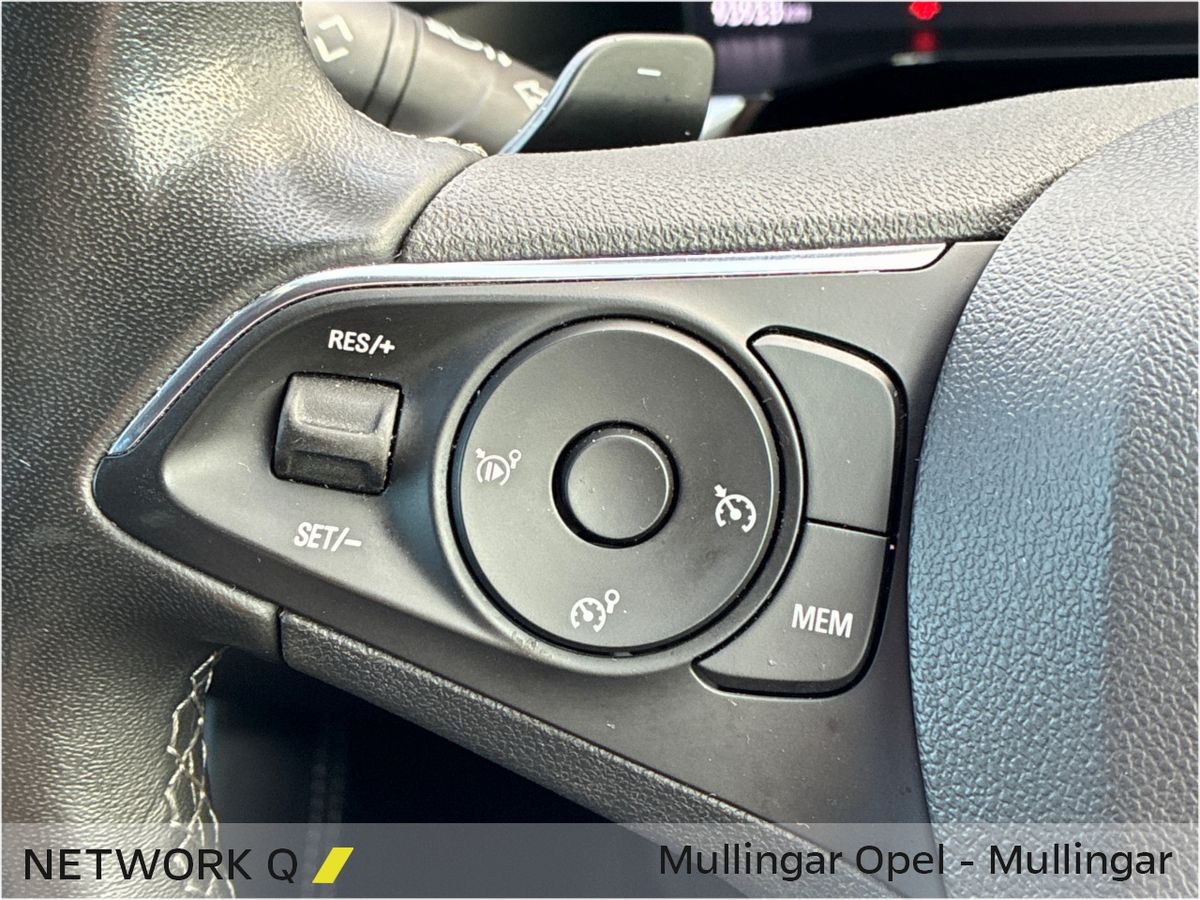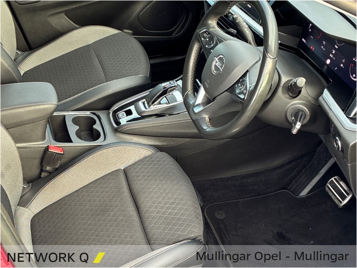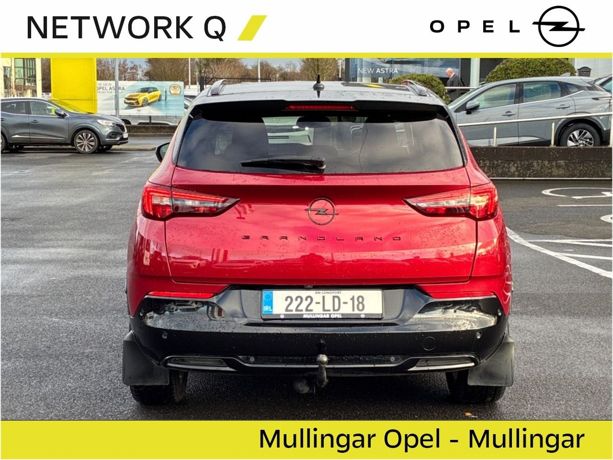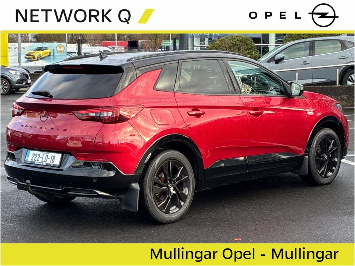 This sporty Automatic Diesel Grandland features Adaptive LED Headlights, Half Leather Upholstery and Contrasting Black Roof, Roof Rails, Mirrors & Wheels.