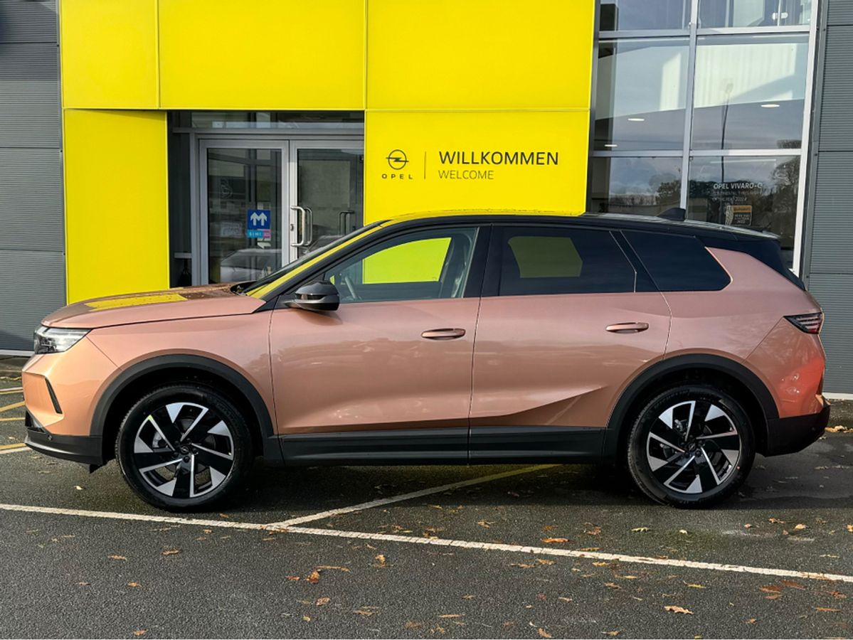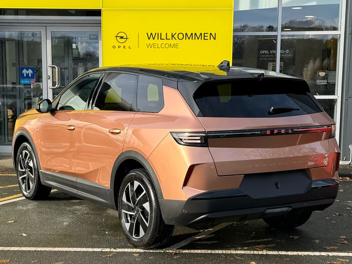 The All-New Opel Grandland GS in Impact Copper. Powered by a 1.2 mild hybrid, PureTech three-cylinder, turbocharged petrol engine, it produces 136hp. It features 19" diamond-cut alloy wheels, heated steering wheel, front and rear seats, a 16" infotainment system, Intelli-Lux Pixel Matrix HD lighting system for high-definition light distribution. It also features AGR front seats, for maximum comfort on every journey, wireless charging and more.